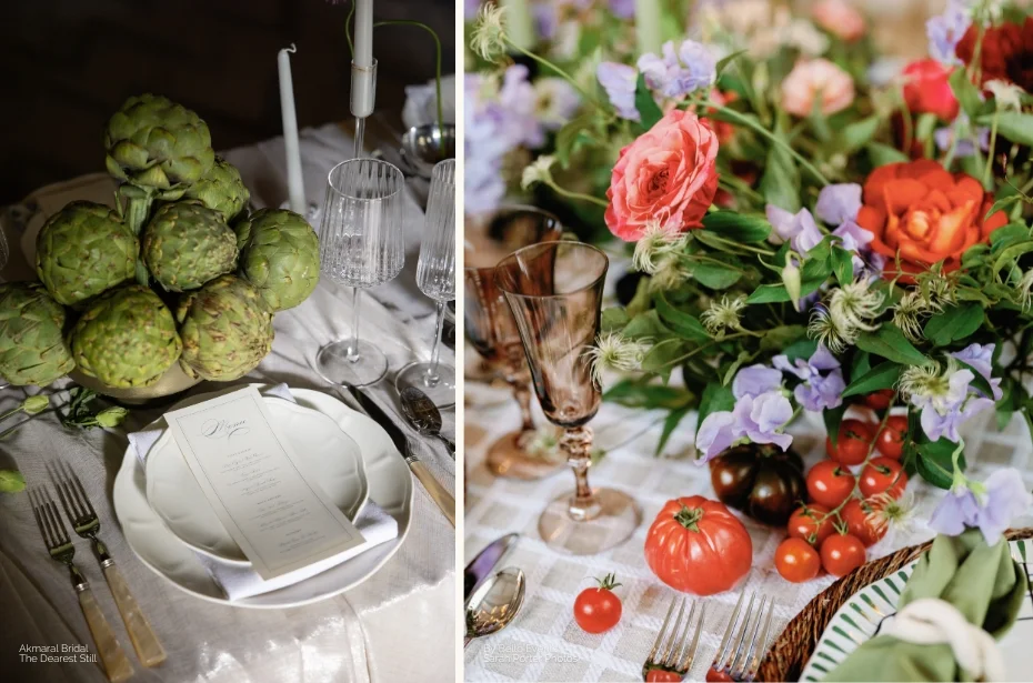 We’ve officially entered our tomato era. This season, tablescape design takes a cue from painterly still lifes: think ripe figs and heirloom tomatoes are styled right into the centerpiece. It’s edible art meets organic abundance. Used alongside soft florals, taper candles and your favorite linens, food becomes an unexpected focal point, not just a side dish.