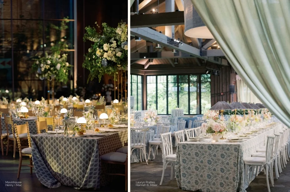 Minimalism had a good run, but this season? Maximalism is back with enthusiasm. From oversized floral installations to embroidered linens and layered tabletop elements, the vibe is bold, brave, and a little theatrical. Picture an Elizabethan theme with velvet draping, gilded flatware, oversized bows, and dramatic silhouettes. Gawdy? Maybe. But in the very best way.