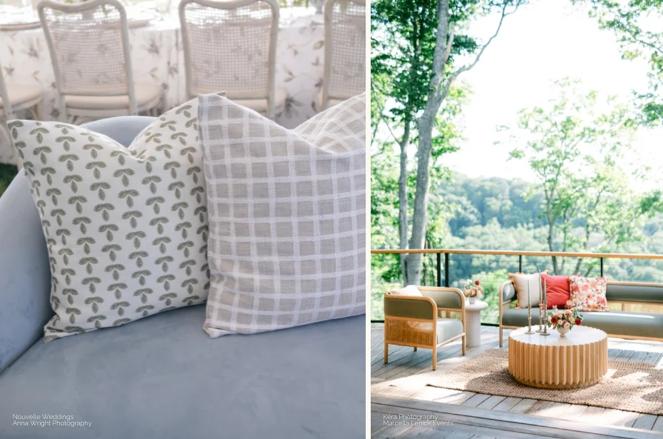 Lounge spaces are leveling up. We’re talking cohesive throw pillow pairings, styled vignettes that mimic your home’s most stylish corner, and seamless tie-ins to your table design. Want your lounge pillows to match your napkins? We’ve got you. Lounge moments aren’t an afterthought anymore, they’re an extension of your tablescape.