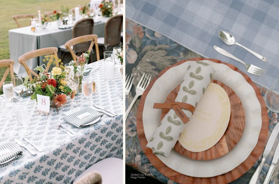 Want to take it even further? Design two looks for your reception: maybe one table features a solid linen with a bold print napkin, and the other flips the script. Cohesive, creative and absolutely photo-worthy.