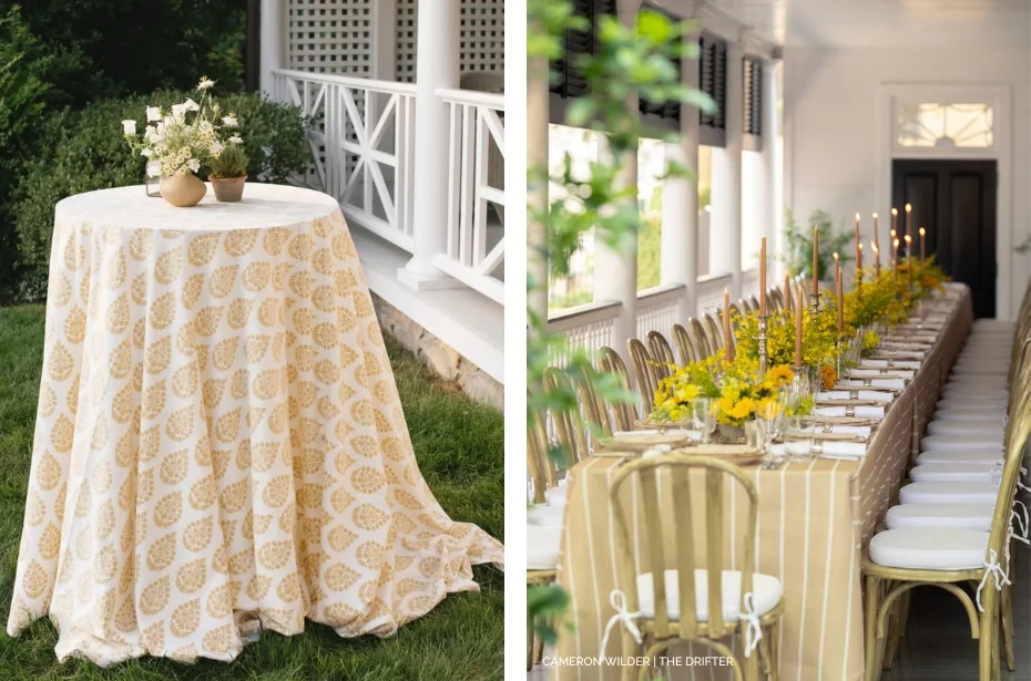 Think of it as citrus couture for your tabletop: vibrant, confident and impossible to overlook. Whether you prefer a soft hint of citrus through runners and napkins or a full mix-and-match moment across your event tables, Island Citrus thrives on texture, tone and thoughtful layering. Start with foundational linens in soft neutrals or a stonewashed print (think Monaco Gold or Amelia Maize), or build dimension via napkins (think Velvet Marigold or for a more subtle touch choose Stonewashed Yellow). Want to get a little tropical? Try our Cabana Stripe Butter. Your table doesn’t need to be dressed top to bottom in yellow; we love tossing in a few complementary citrus hues like tangerine and pomegranate (looking at you, Ali Tangerine) And don’t be afraid to experiment with a little contrast. Layering woven textures with airy fabrics or pairing solids with statement napkins creates a tablescape that feels intentional, elevated and delightfully unforgettable.