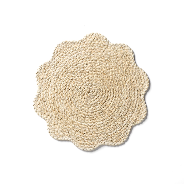 Mari Scallop Natural Woven features a braided jute design in a natural rattan tone, finished in a floral-inspired scalloped edge. The texture adds warmth and dimension, while the shape brings a soft, decorative detail to the table. Easy, organic, and quietly elevated, it’s a natural choice for garden tables, outdoor celebrations, and layered place settings.